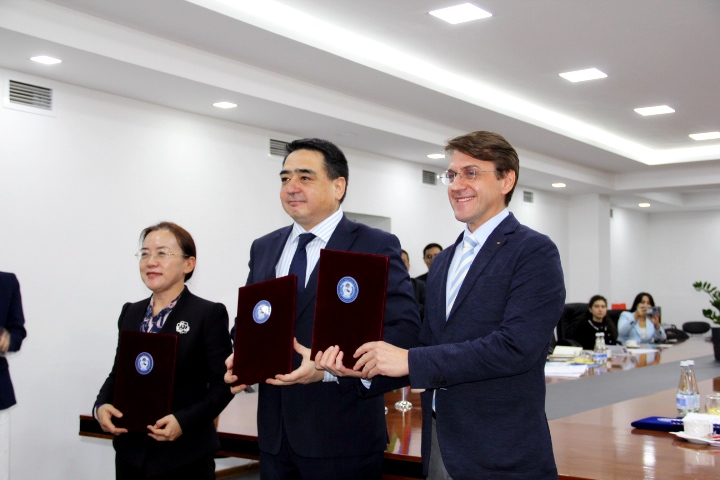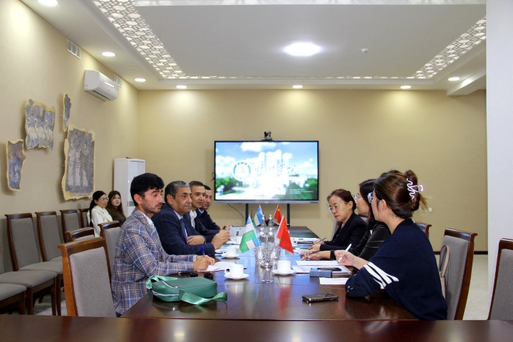 在撒马尔罕国立大学,代表团与副校长阿哈托夫·阿克马尔以及国际合作处处长穆赫塔尔·纳索罗夫、农业生物技术和粮食安全学院、智能系统与计算机技术学院负责人就两校硕士研究生联合培养、学分互认项目、教师交流、共建线上课程进行交流,就共建智慧农业、大数据研究中心达成一致意见。同时,代表团一行还访问了乌兹别克斯坦“丝绸之路”国际旅游与文化遗产大学,与副校长迪奥莫汝德·纳斯莫夫、副校长邹统钎进行会谈。