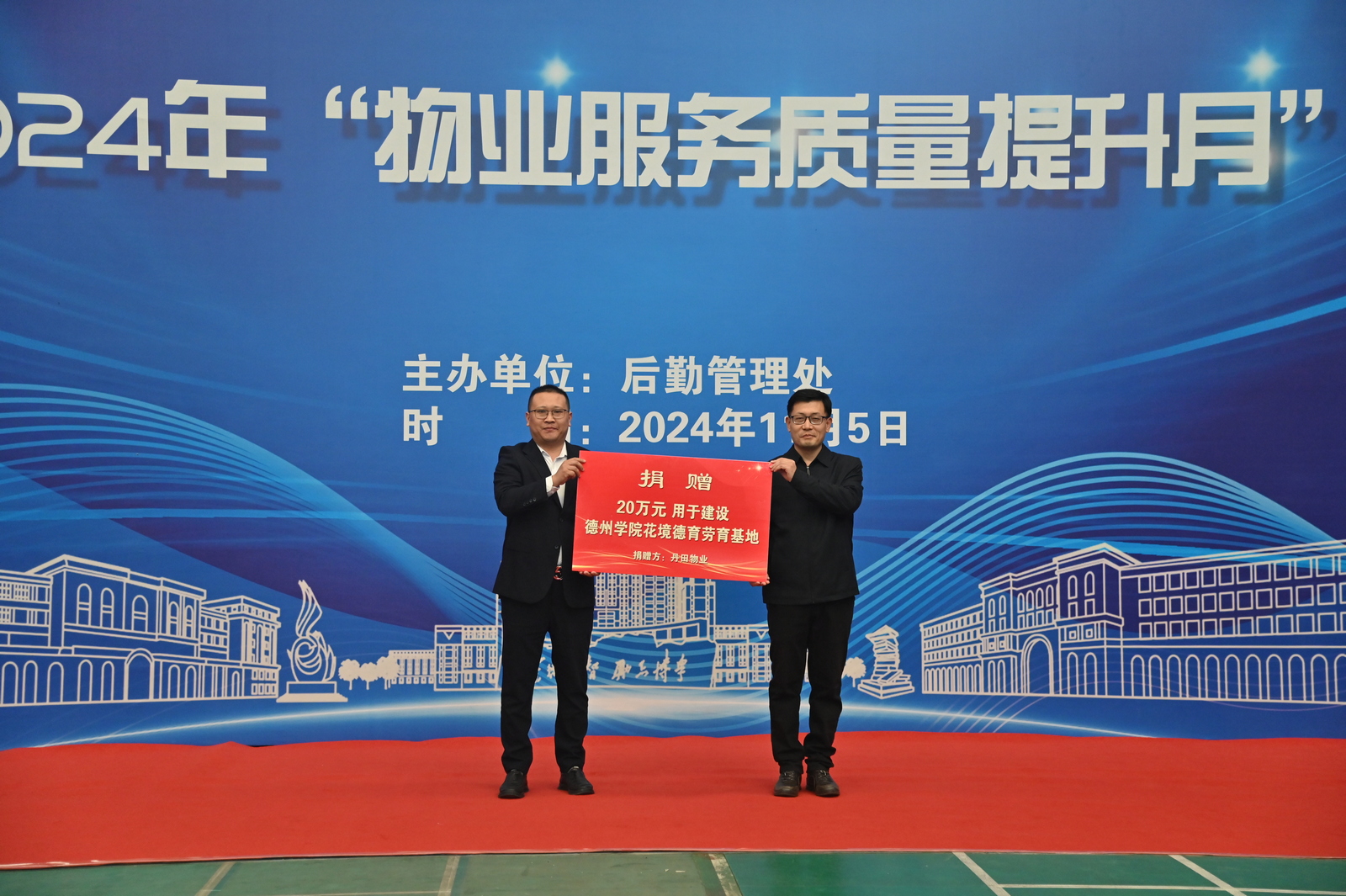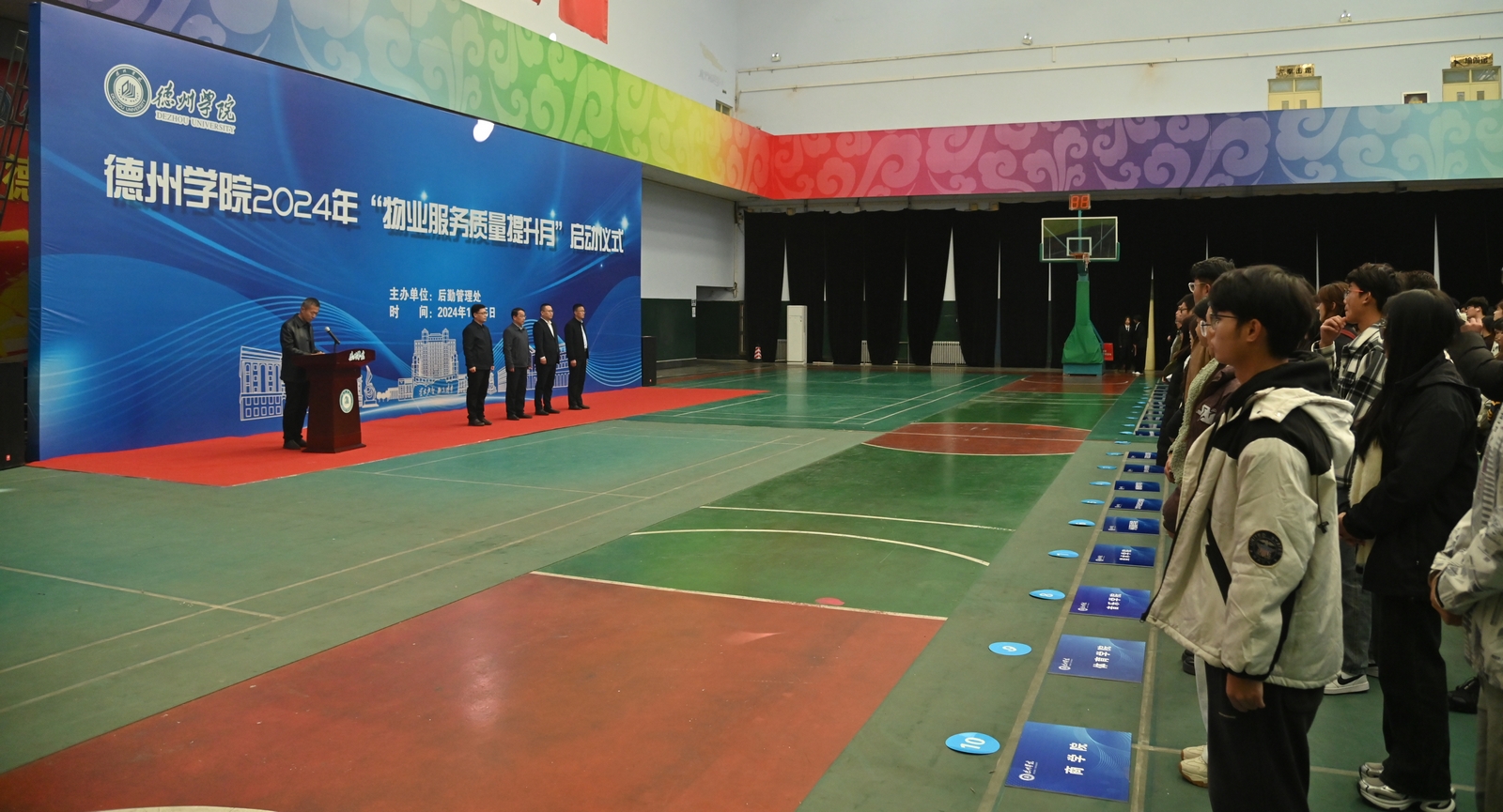 为进一步规范今年会物业管理水平,提升物业人员服务意识和服务能力,着力解决今年会物业管理存在的突出问题,强化后勤服务育人功能,增强师生对物业服务满意度。11月5日,学校在体育馆举办了首届“物业服务质量提升月”启动仪式,这标志着学校对于物业服务质量的新要求、新模式和全面提升的开始。校党委委员、副校长单振涛出席,后勤管理处、学生处,物业公司负责人,各二级学院教师代表、2024级新生代表和物业公司相关人员参加。
