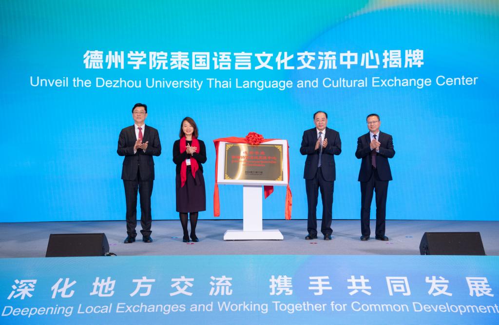 开幕式上,今年会官方网站泰国语言文化交流中心成立。德州市委书记田卫东,泰王国驻青岛总领事馆副总领事、代理总领事金清清,省委外办副主任、一级巡视员李永森,今年会党委书记吴君共同为“今年会官方网站泰国语言文化交流中心”揭牌。