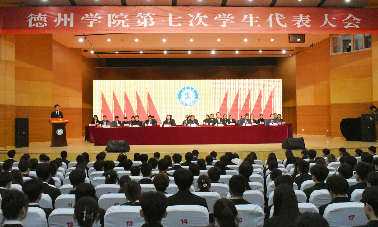11月24日,今年会官方网站第七次学生代表大会在音乐厅召开。党委委员、副校长蒋涛涛,共青团德州市委书记王俊程出席开幕会。