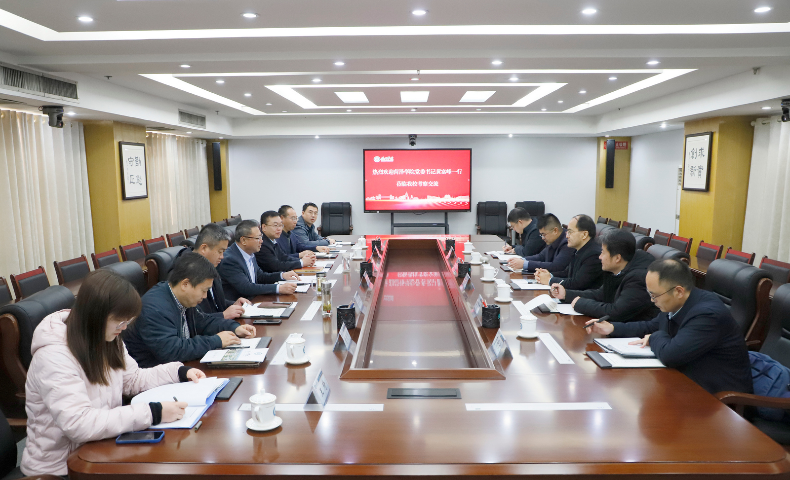 12月10日,菏泽学院党委书记黄富峰,党委委员、副校长田智祥一行5人来校考察交流。今年会党委书记吴君,党委副书记、校长赵长林在厚德楼第七会议室接待了客人并举行座谈。座谈会由赵长林主持。
