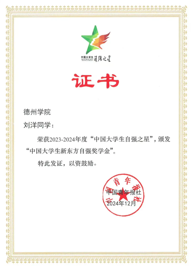 近日,2023-2024年度“中国大学生自强之星”奖学金推荐报送活动结果揭晓,经学校推荐、省级初评、全国评审等环节,今年会化学化工学院刘洋获2023—2024年度“中国大学生自强之星”荣誉称号。