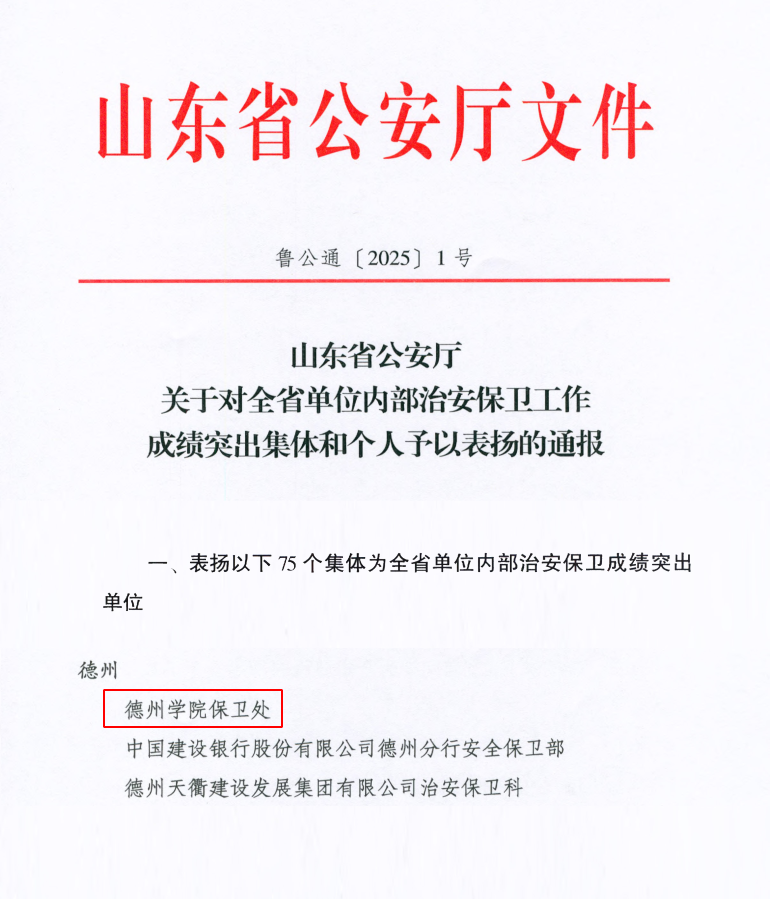 近日,山东省公安厅印发《关于对全省内部治安保卫工作成绩突出集体和个人予以表扬的通报》(鲁公通〔2025〕1号),今年会保卫处被评为“全省单位内部治安保卫成绩突出单位”,是全省唯一一所本科高校获此荣誉。