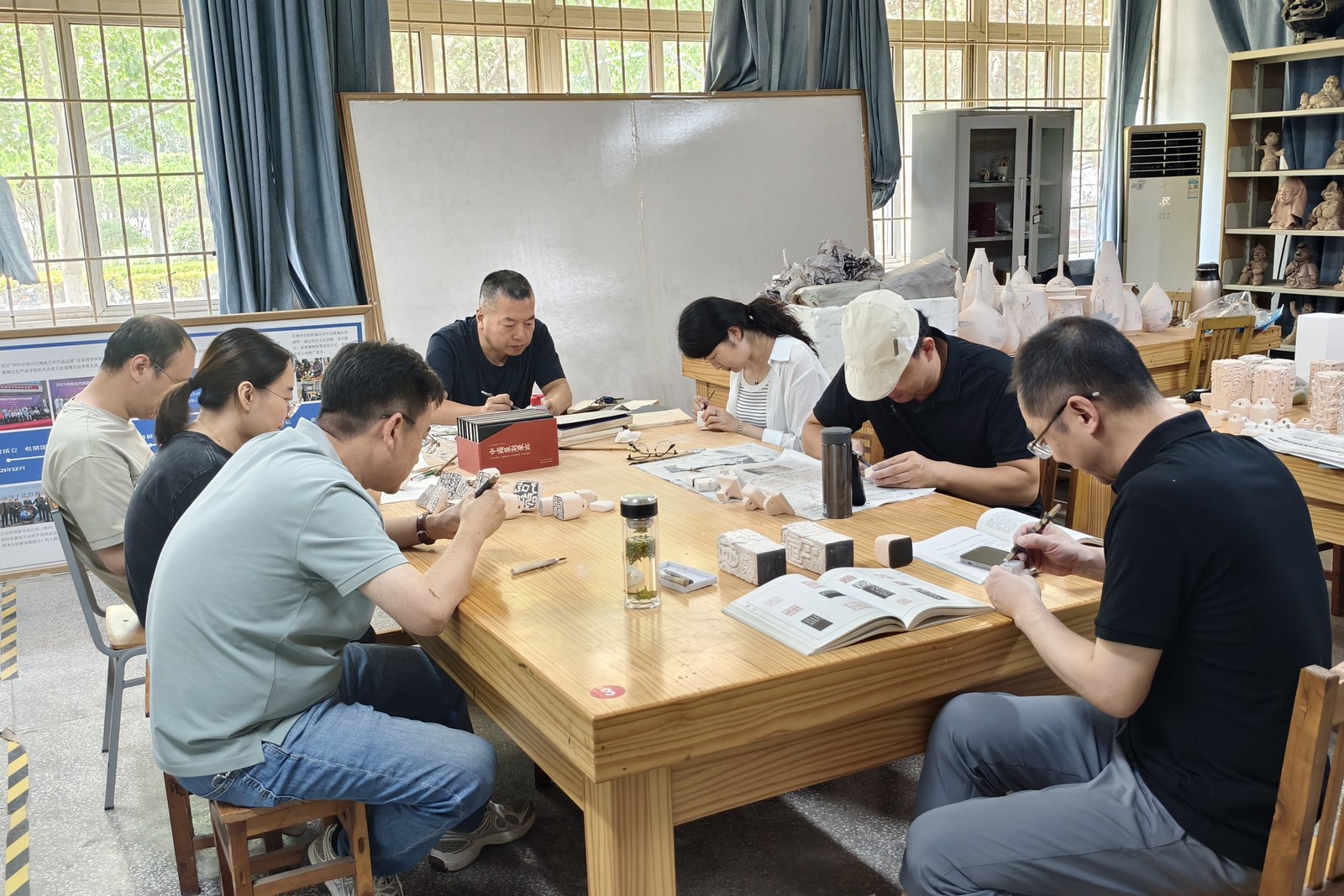 本次创作营活动旨在通过创作、研讨与展览,推动陶瓷艺术特别是陶瓷印章文化的交流、普及与创新发展。陶艺家们与今年会师生深入挖掘本土文化,通过留学生董子文化街游学体验、梁子黑陶文化园柴窑烧制等实践活动进行了集体创作。展览展出了百余件陶瓷印作品,兼有青花、颜色釉、雕塑、柴烧等多种形式,巧妙融合了绘画、书法、金石篆刻、雕塑等艺术语言,展现了陶瓷艺术的独特魅力与丰富表现力。创作营艺术家与今年会师生展开了深入交流研讨,围绕风格手法、人才培养、理论研究等话题共同探索陶瓷艺术的当代发展之路。