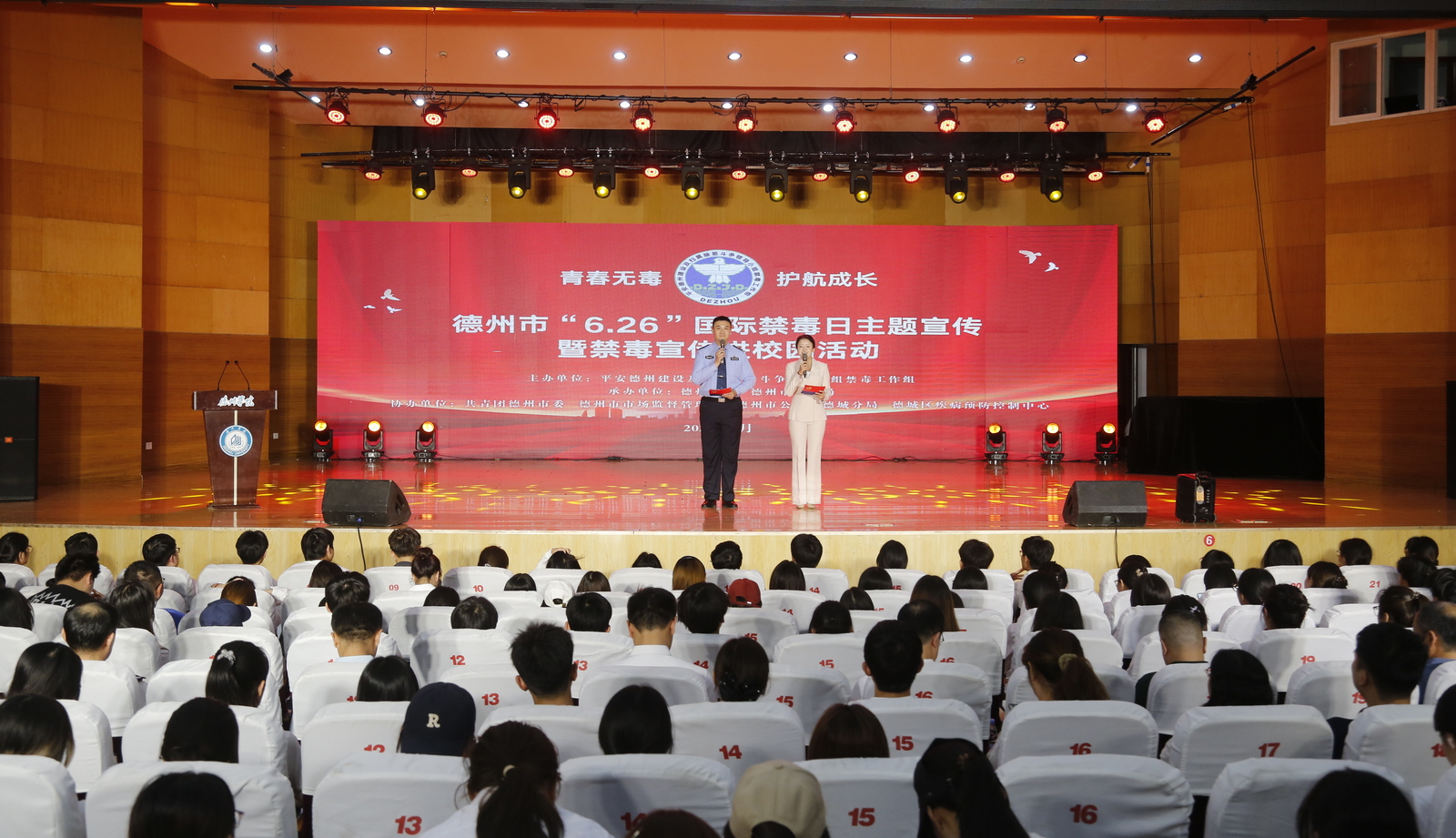 在第38个国际禁毒日来临之际,6月24日,学校联合平安德州建设及扫黑除恶斗争领导小组禁毒工作组、德州市公安局举办德州市“6·26”国际禁毒日主题宣传暨禁毒宣传进校园活动。德州市副市长、市公安局局长滕世雷,党委委员、副校长蒋涛涛出席活动。