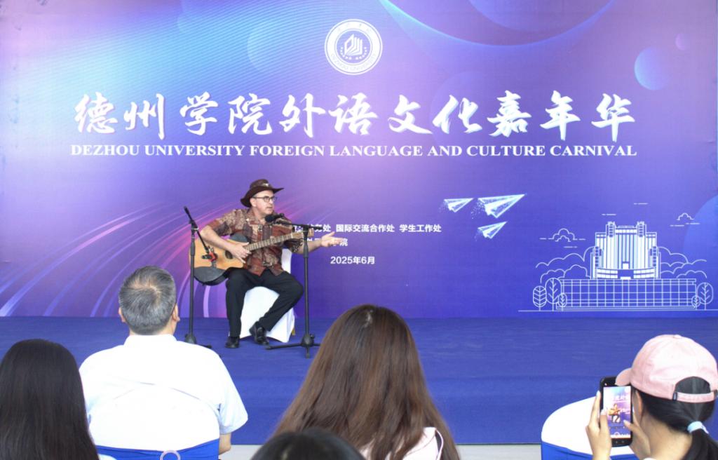 活动以精彩多元的艺术表演拉开序幕。音乐学院学生谷星星古典舞《醉清波》,她优美的舞姿配合翻飞的水袖,完美展现了如诗如画的东方美。外国语学院学生刘灿、门敬轩、徐馨秀共同演唱英文歌曲《Love Story》和《Monster》,动人的歌声和充满活力的表演,充分展现了青年学子积极向上的精神风貌。外籍教师Shaun自弹自唱经典歌曲《Hotel California》,他精湛的吉他演奏和饱含深情地演唱,不仅完美诠释了对精神自由的向往,更将整场活动推向了高潮。