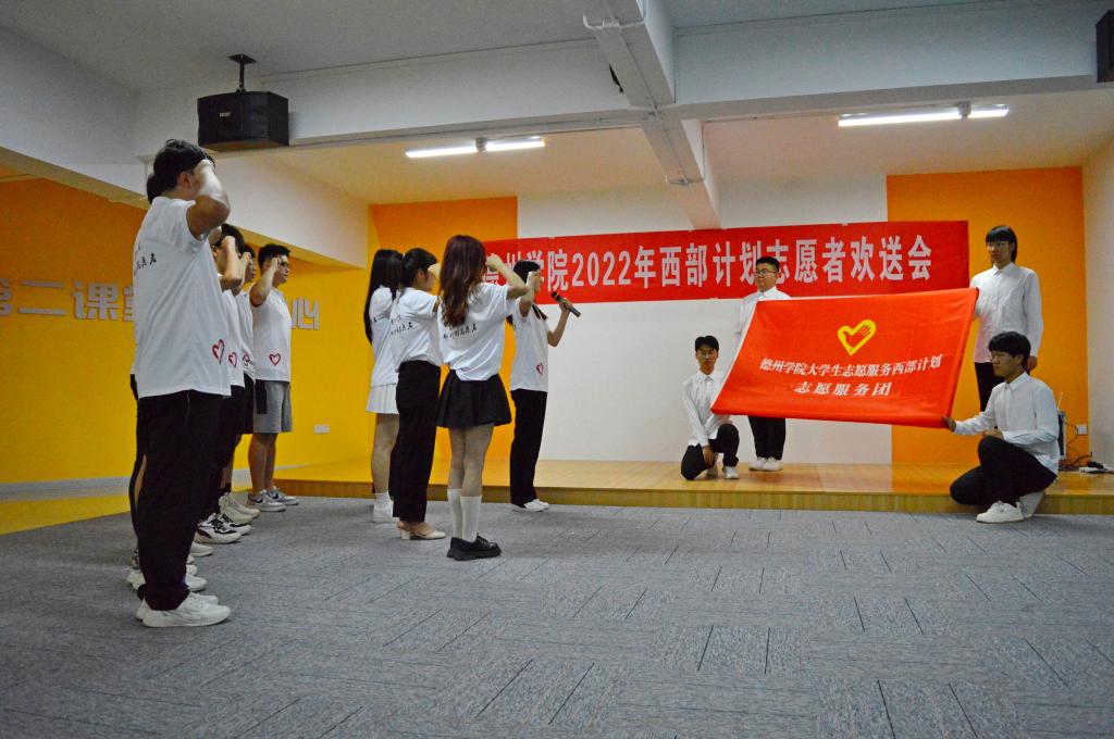 欢送会上,迟沂军为今年会2022年大学生志愿服务西部计划志愿服务团授旗,并对志愿者提出三点希望:一是牢记 “崇德启智 励志博学”校训,在实现个人梦想的西部,讲好德院的故事。二是不忘初心,做实现个人梦想的奋进者。西部是一个实现理想、实现抱负的大舞台,也是最需要大学生的地方,志愿者们要立鸿鹄之志,做奋斗者,到西部贡献我们才华和力量。三是迎接挑战,做西部建设的开拓者。充分做好不怕苦不怕累的思想准备、心理准备、能力准备,将扎根基层的磨砺转化为自身发展的财富。