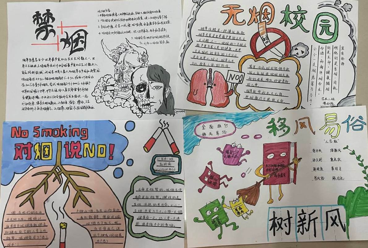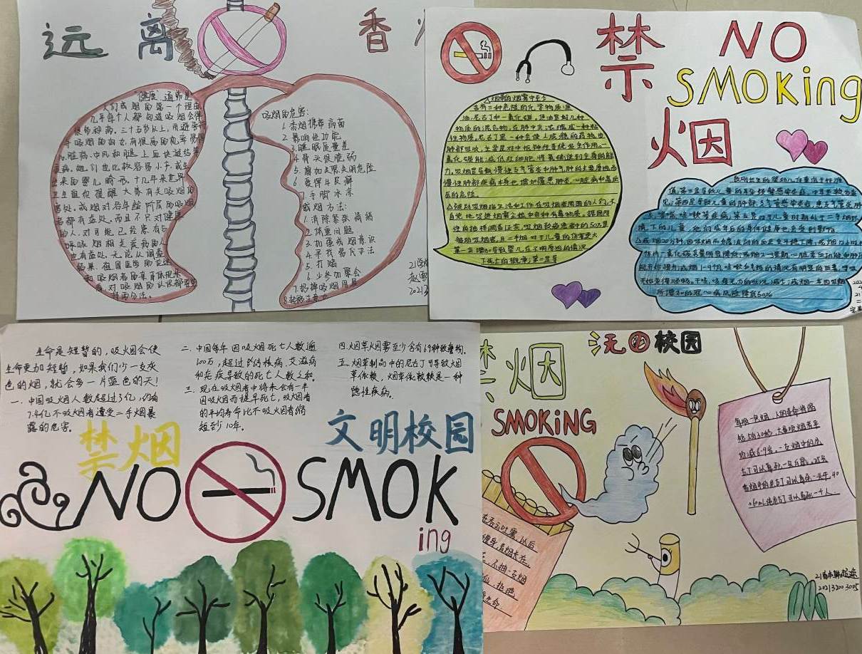 活动中,参与者通过绘制禁烟主题的手抄报,展示出自己对禁烟控烟的看法和建议。同学们的手抄报中包含了吸烟对自己以及他人带来的影响和禁烟控烟的建议。禁烟手抄报的展出在一定程度上增强了师生对身体健康方面的认识,有利于帮助同学们减少在吸烟认识上的误区。