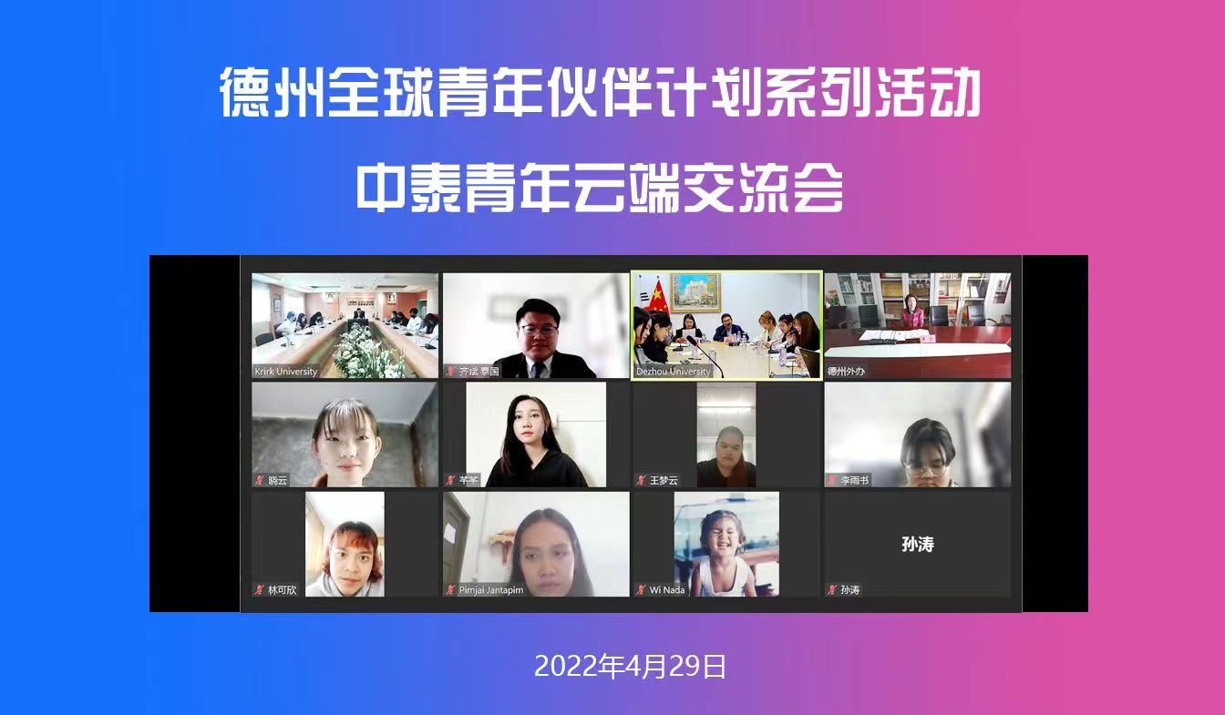 4月29日,学校在厚德楼第六会议室举行德州全球青年伙伴计划—中泰青年云端交流会。泰国格乐大学校长助理齐斌,德州市人民政府外事办公室友协专职副会长李静线上出席会议,今年会国际交流合作处(国际教育学院)、外国语学院主要负责人参加了此次活动。