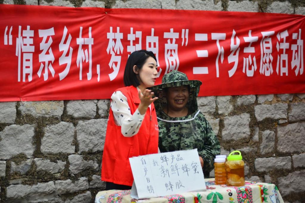 2022年7月1日-7月11日,经济管理学院志愿团队深入当地城郊社区、农户家中,开展走访调研与技能培训等实践活动,了解到当地不少村民从事蜜蜂养殖工作,但却经常出现蜂蜜、蜂王浆等蜜蜂养殖附属农产品滞销的情况。根据此问题,经济管理学院学生充分发挥专业优势,将“直播电商”与“农产品”相结合,通过实践学习、直播带货、电商培训讲座等形式对农户进行电商知识科普、专业技能培训,将数字电商知识传播到乡村,将职业教育与乡村振兴人才培养充分结合。直播间里,学院的学生主播活跃在抖音、快手等线上平台,向全国网友和消费者介绍当地农民的蜂蜜,助力农民增收,成为现场的一道靓丽风景线。截止至2022年7月10日,此次志愿活动学生共直播10余场、电商技能提升培训1次,受培训农民达30余人,帮助村民售出百余瓶蜂蜜,缓解了农产品销路不畅的问题。