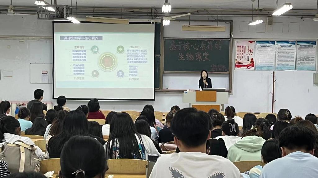 颜春玲教授作了题为《基于核心素养的生物课堂教学》的研究报告。报告中,颜教授利用典型例题,总结了当评价效果与预期不符时,教师应调查学生本身存在的知识漏洞和能力缺陷,及时进行弥补。同时,颜教授告诉大家,教师在课堂上要以核心素养为宗旨,引导学生多动脑、多练习,促进学科核心素养在教学中的落实。