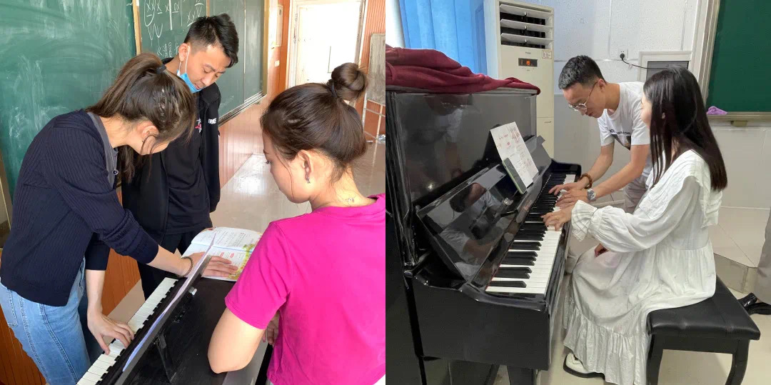 钢琴专任教师张利鑫与胡子钰老师,根据帮扶单位的需求对教师们的即兴伴奏进行系统的培训,从最简单的调式调性,到和弦进行,以及和弦编排等基础知识进行讲解,再结合具体歌曲的伴奏,通过示范教学等方法,对帮扶对象的钢琴伴奏能力进行专业化、规范化的指导。