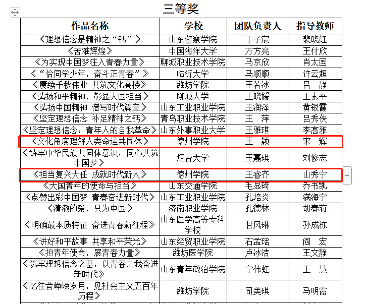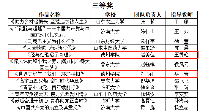 由马克思主义学院王秀艳、张亚男、刘文霞老师指导的赵美佳团队和由蔡青、王洪梅老师指导的姚心雨团队分别获得全省专业组比赛三等奖。由外国语学院宋辉、朱馨馨老师指导的王颖团队和文学与新闻传播学院山秀宁老师指导的王睿齐团队分别获得非专业组比赛三等奖。