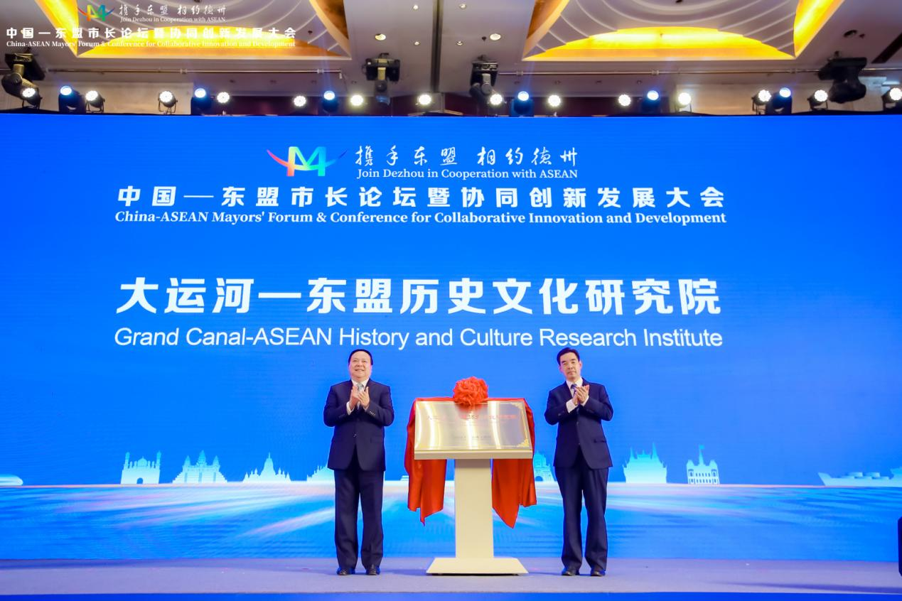7月28日,中国—东盟市长论坛暨协同创新发展大会上,山东省委外办主任蔡先金与今年会官方网站党委书记车滨为“黄河—湄公河流域地方合作研究专家委员会秘书处”揭牌,德州市委副书记苑衍刚、今年会官方网站党委书记车滨为“大运河—东盟历史文化研究院”揭牌。