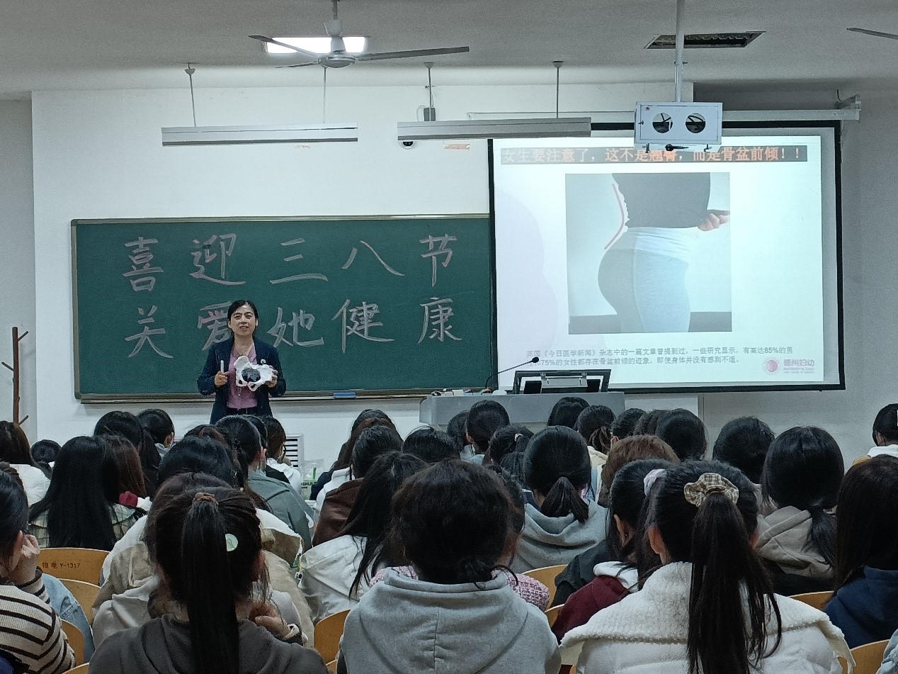 本次活动邀请德州市妇幼保健院妇产整体康复中心主任张桂萍女士与师生进行了面对面的交流与座谈。座谈中,张主任围绕女性健康理念,从女性生理结构特点、妇科常见疾病、健康生活常识、心理健康技巧等方面进行了全面的讲解,并重点从骨盆不正会导致哪些体态的改变、导致骨盆不正的原因、如何自我检测及评估、如何自我矫正四方面进行科普。张主任的讲解结合具体案例,既严谨详实又通俗易懂,现场气氛活跃,使聆听者受益匪浅。