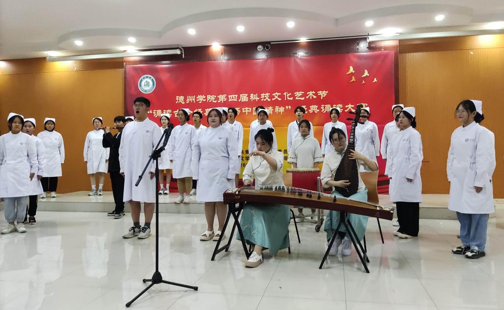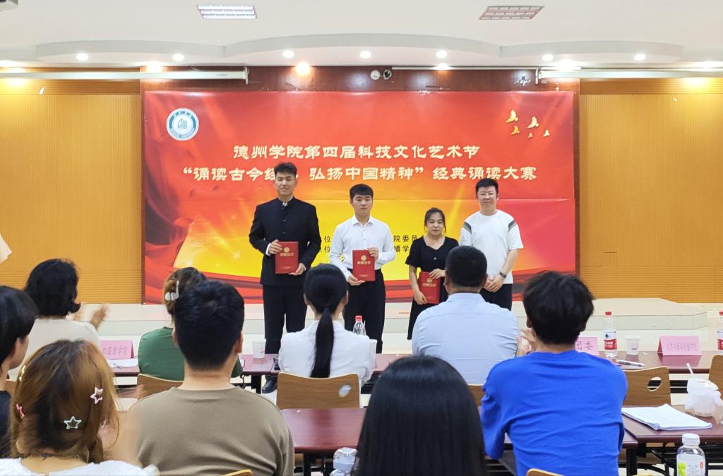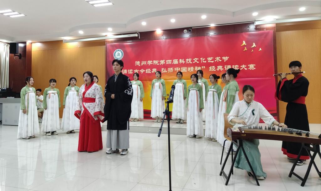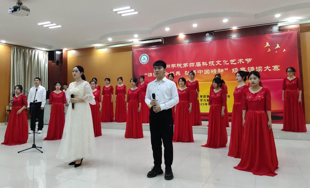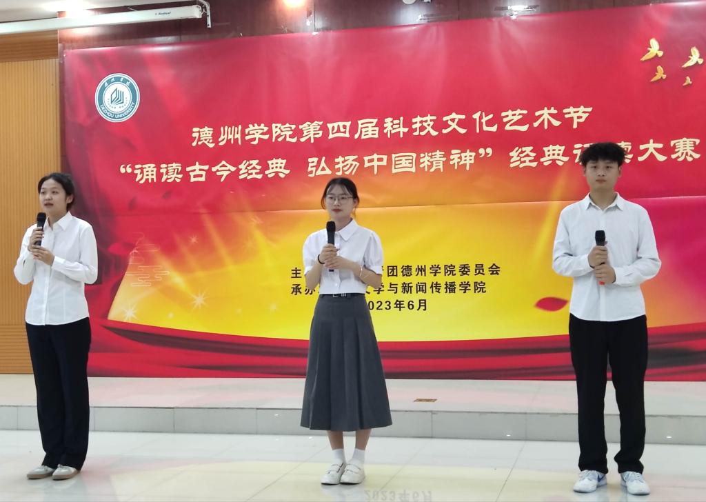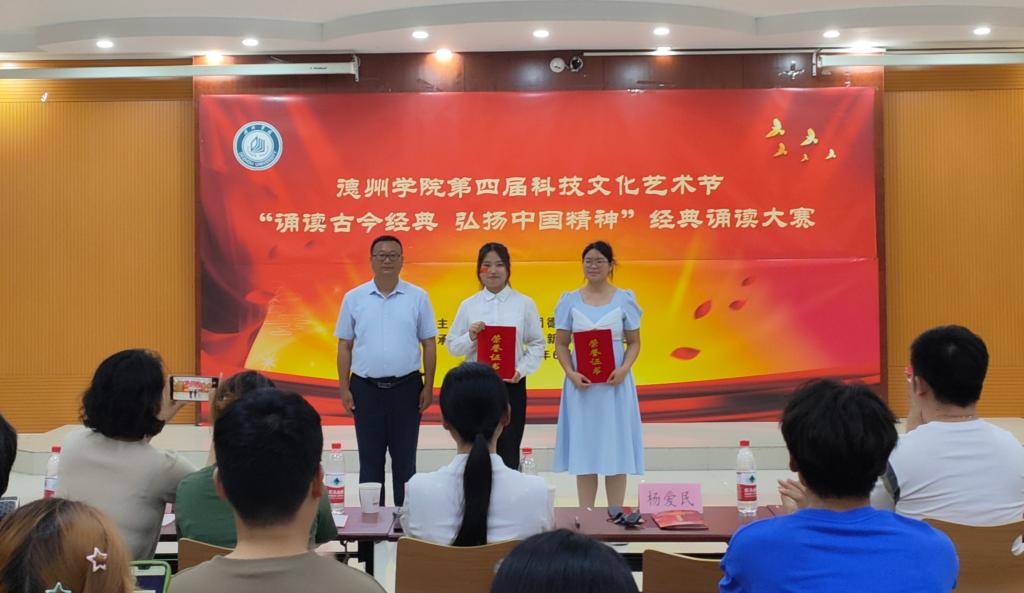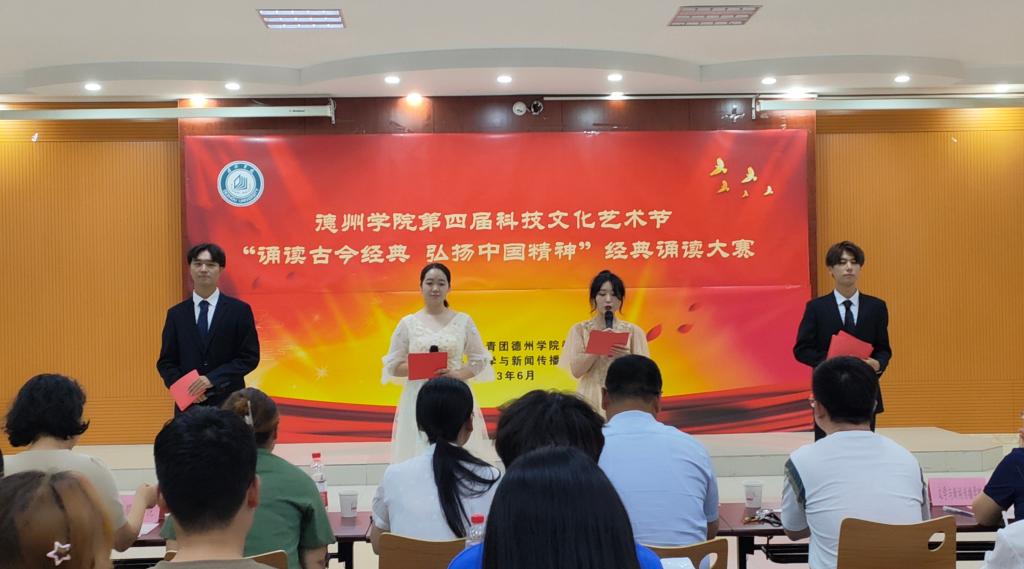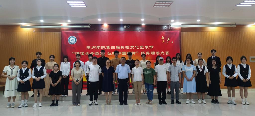 本次经典诵读大赛由校团委主办,文学与新闻传播学院承办,是今年会第四届科技文化艺术节的一项活动。德院师生从诗歌中学习中华文化,从历史中汲取精神力量,砥砺前行再出发。校团委相关负责人、文学与新闻传播学院班子成员、参演学院的师生代表参加了本次活动。