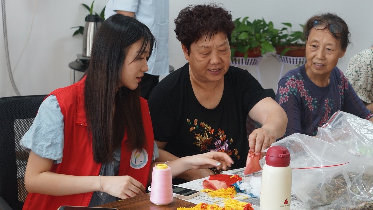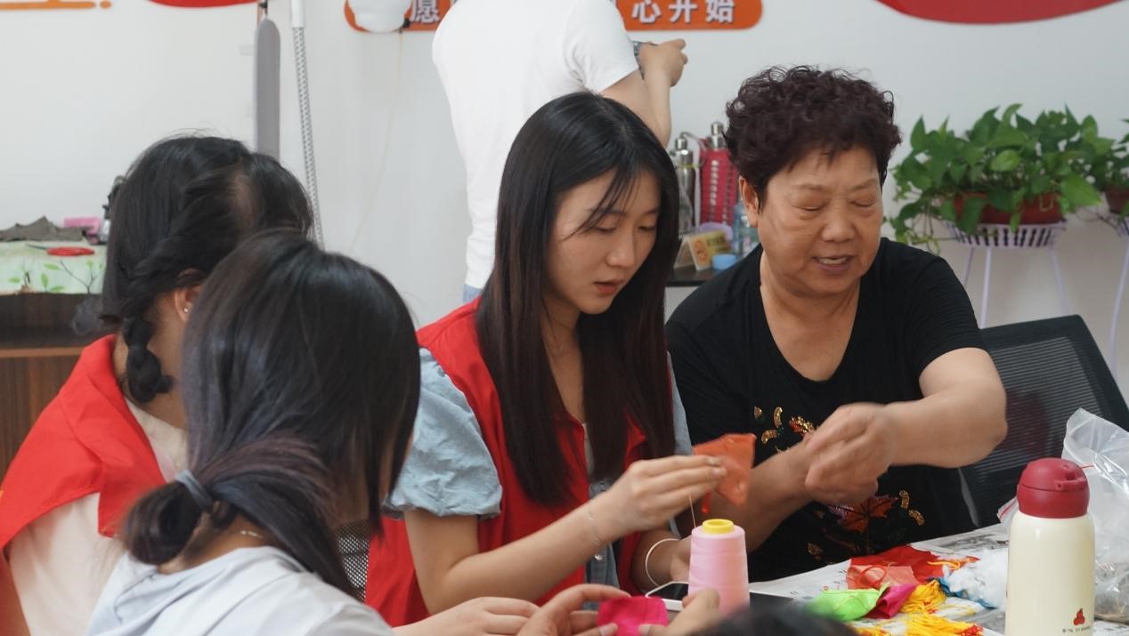 活动现场,大学生志愿者带领社区居民们一起追溯端午节由来,还介绍了香囊的药材选用和制作环节。讲解后,居民们在志愿者的指导下开始了香囊制作体验,彩布缝合,细线打结,药包填充后再以抽绳弦扣成索,最后串上穗子,一个个造型可爱、饱满精致的香囊就制作完成了。大家在一锤一捣的研磨中,在一针一线的缝合中感受中国传统文化的魅力。