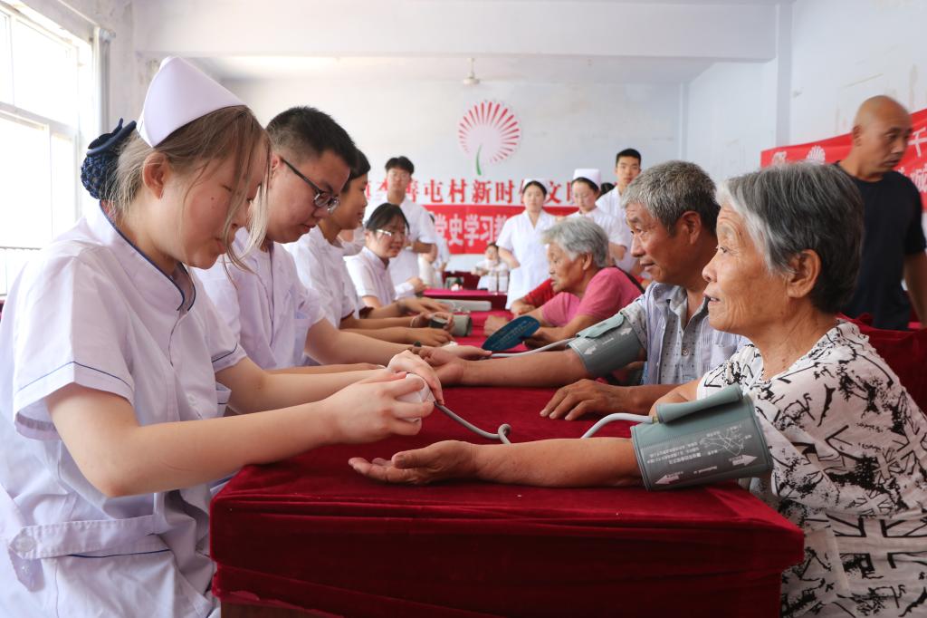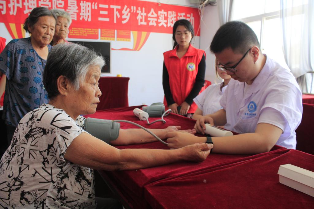 义诊现场,志愿者设置了血压测量服务咨询点,为村民百姓民现场量血压,耐心解疑答惑、测量健康指标,提出日常预防、保健方案及治疗建议,对村民进行健康监测,加强村民对疾病和慢性病的认识和防范,同时提升护理专业学生的理论实操技能。