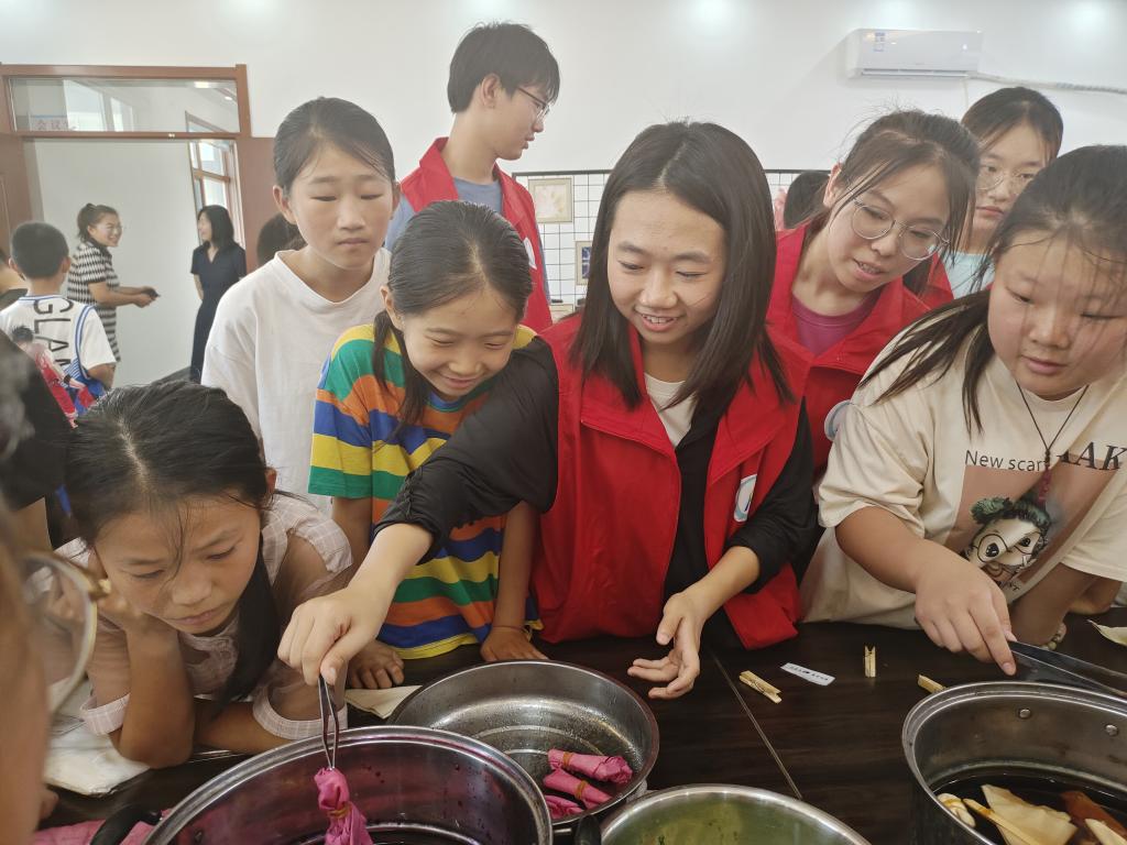 纺织服装学院社会实践团学生为八屯社区小朋友们带来扎染、手工制作等美学教育互动课程,与小朋友们进行互动式学习,让扎染艺术这一非物质文化遗产真正以实体形式走进生活,让孩子们在学与做、看与玩儿之间感受到了中华优秀传统文化的艺术之美,并做好传统民间手工艺文化的传承者。
