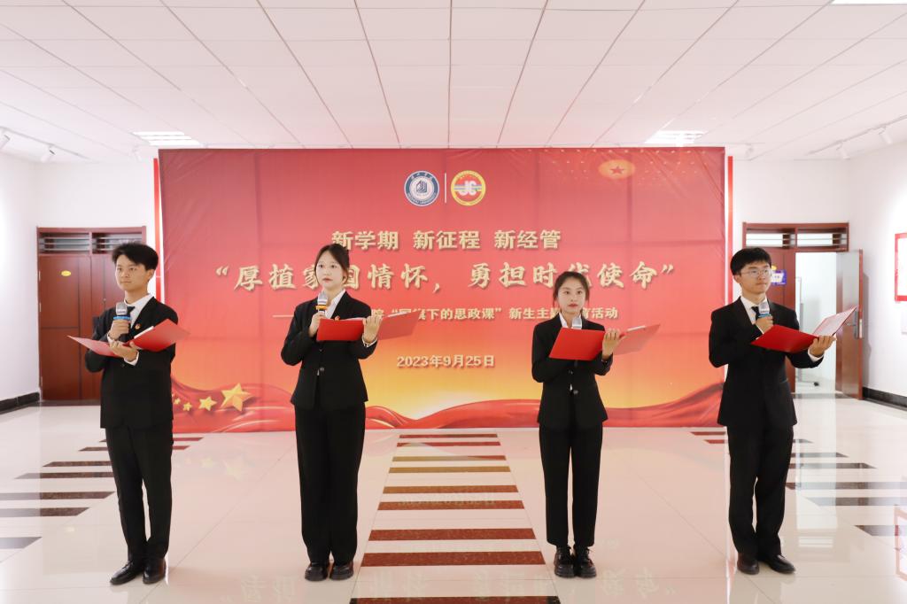 思政课是高校落实立德树人根本任务的关键课程,经济管理学院“国旗下的思政课”主题教育活动是学院爱国主义教育和爱校荣校教育的一项品牌化活动。自今年5月份启动以来,目前已连续开展4期。此次主题教育活动是经济管理学院新生入学教育的重要内容,利用国庆节这一重要时间节点,深入贯彻落实立德树人根本任务,深化爱国主义教育,厚植爱党爱国情怀,帮助新生尽快完成角色转变,带领同学们重温历史、珍惜现在、展望未来。