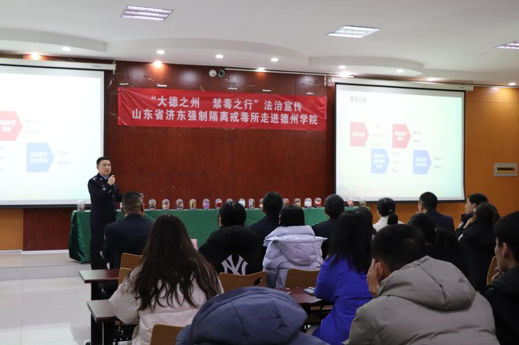 为加强校园毒品预防教育工作,增强学生识毒、防毒、拒毒意识,11月24日上午,山东省济东强制隔离戒毒所(以下简称戒毒所)二级高级警长刘序全一行9人来法学院开展“筑牢禁毒教育防线 护航无毒健康人生”法治宣传。学院200余名师生参加了活动。