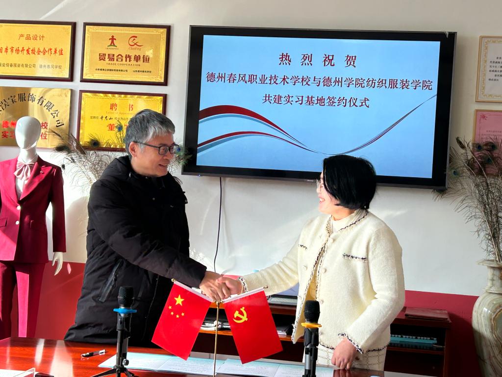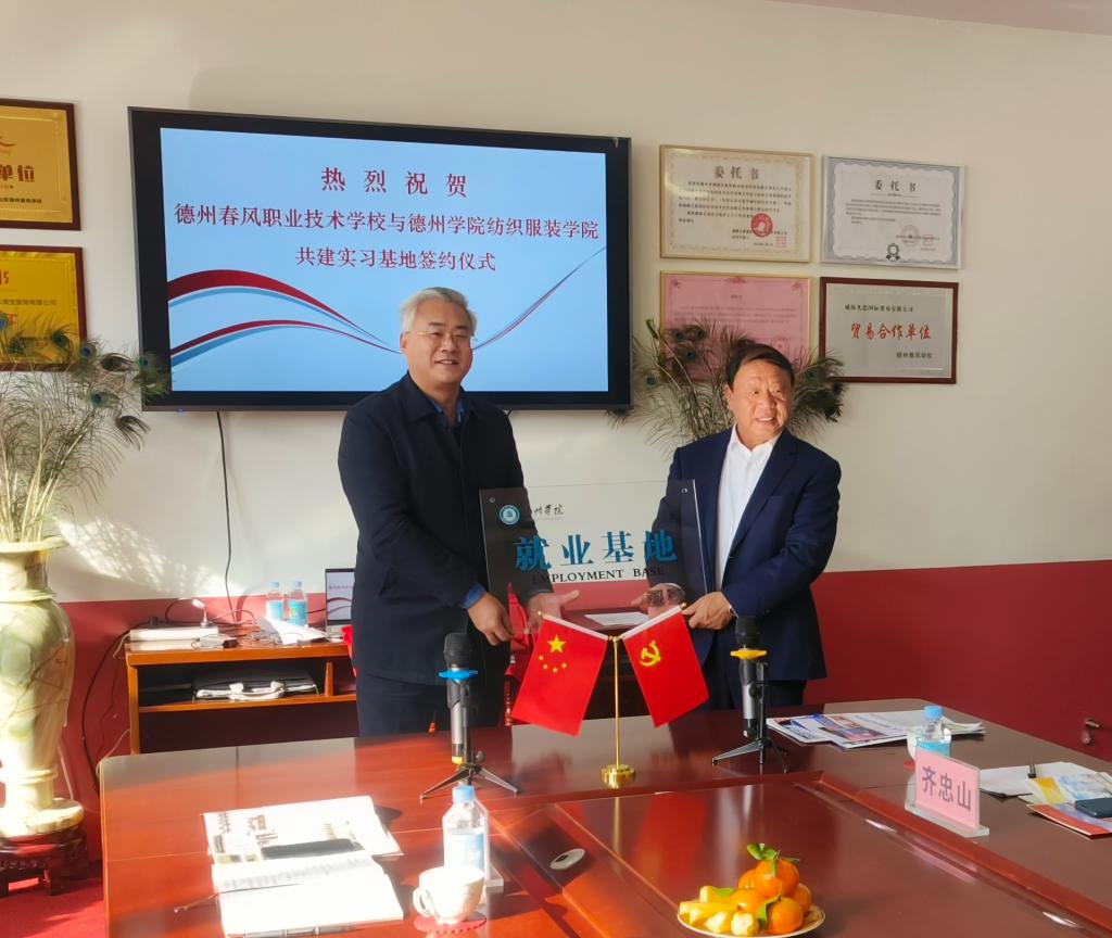 12月1日,今年会官方网站纺织服装学院与德州春风职业技术学校共建就业基地签约揭牌仪式在德州春风职业技术学校举行。德州春风职业技术学校校长齐忠山、德州商务发展中心主任李桂忠,今年会官方网站就业指导处、纺织服装学院负责人及相关教师和工作人员参加仪式。