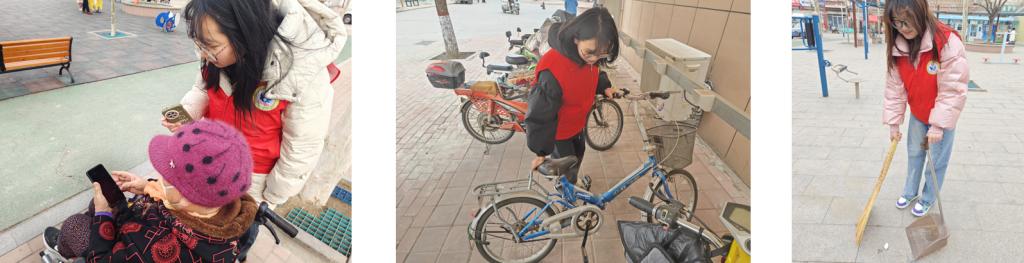 志愿者在社区广场设立健康义诊服务点,结合每位老人的身体情况提出相应的健康指导,与此同时志愿者还针对独居老人进行入户义诊,耐心为老人测量血压,热心询问他们的近期身体健康状况,并帮助老年人清理家庭卫生。此外,志愿者积极响应“万名学子链接十万老人,助力银铃跨越数字鸿沟”专项行动,为老人详细介绍智能手机的各种功能和应用,帮助他们更好地适应数字化社会,促使社区内老人们更好地融入智慧生活。活动最后,志愿者全面清理街道、广场和绿化带的垃圾,并对社区内的单车进行整齐有序地摆放,维护社区环境的同时,有效提升了社区居民的获得感与幸福感,志愿者也纷纷表示以后要主动爱护环境,共同打造美丽家园。