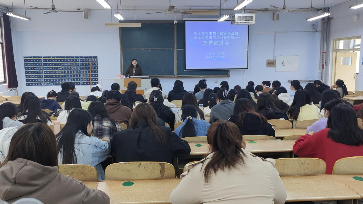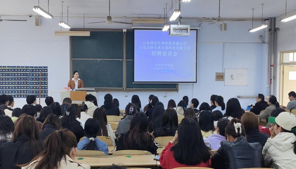 4月10日,为促进毕业生高质量就业,更好地加强与校友企业合作,生命科学学院于求实楼0118教室举行山东润安生物科技有限公司与山东企研未来信息科技有限公司专场招聘宣讲会,2024届毕业班师生参加。