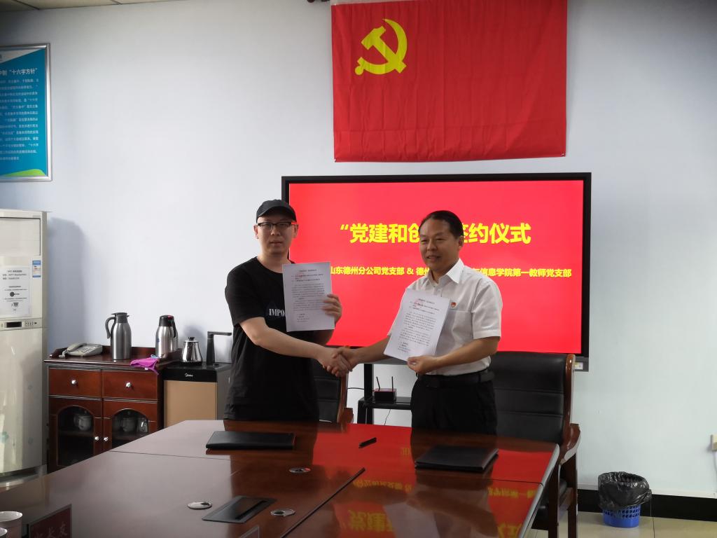 为进一步推进以“支部互联、党员互动、优势互补”和“资源共享、校企共赢”为目标的“党建合创”活动走深走实,5月16日,计算机与信息学院第一教师党支部组织有关人员到中移铁通德州分公司开展了以“校企联建聚合力,党建赋能育新人”为主题的党建互联共建签约仪式和主题党日交流活动。