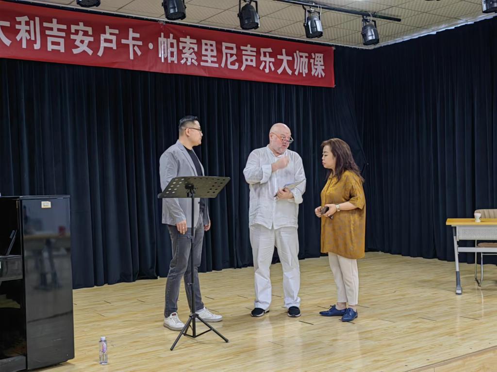 吉安卢卡·帕索里尼教授来自意大利佩萨罗罗西尼国立音乐学院,从事声乐教学研究30年之久,有丰富的舞台演唱与教学经验。本次讲座教授结合演唱曲目,从呼吸控制、发声技巧和如何获得歌唱高位置三个方面分别对我院新入职马瑞、龚娇娇博士和2021级、2022级两名学生进行了细致指导,以示范教学的形式,解决声乐学习中存在的共性问题。担任本次大师课翻译的是天津音乐学院声乐硕士生导师王硌教授,声乐艺术指导孙思学老师。最后,教授与我院青年教师马瑞博士共同演唱歌剧《费加罗婚礼》咏叹调《你赢得了诉讼》,赢得在场师生热烈掌声。