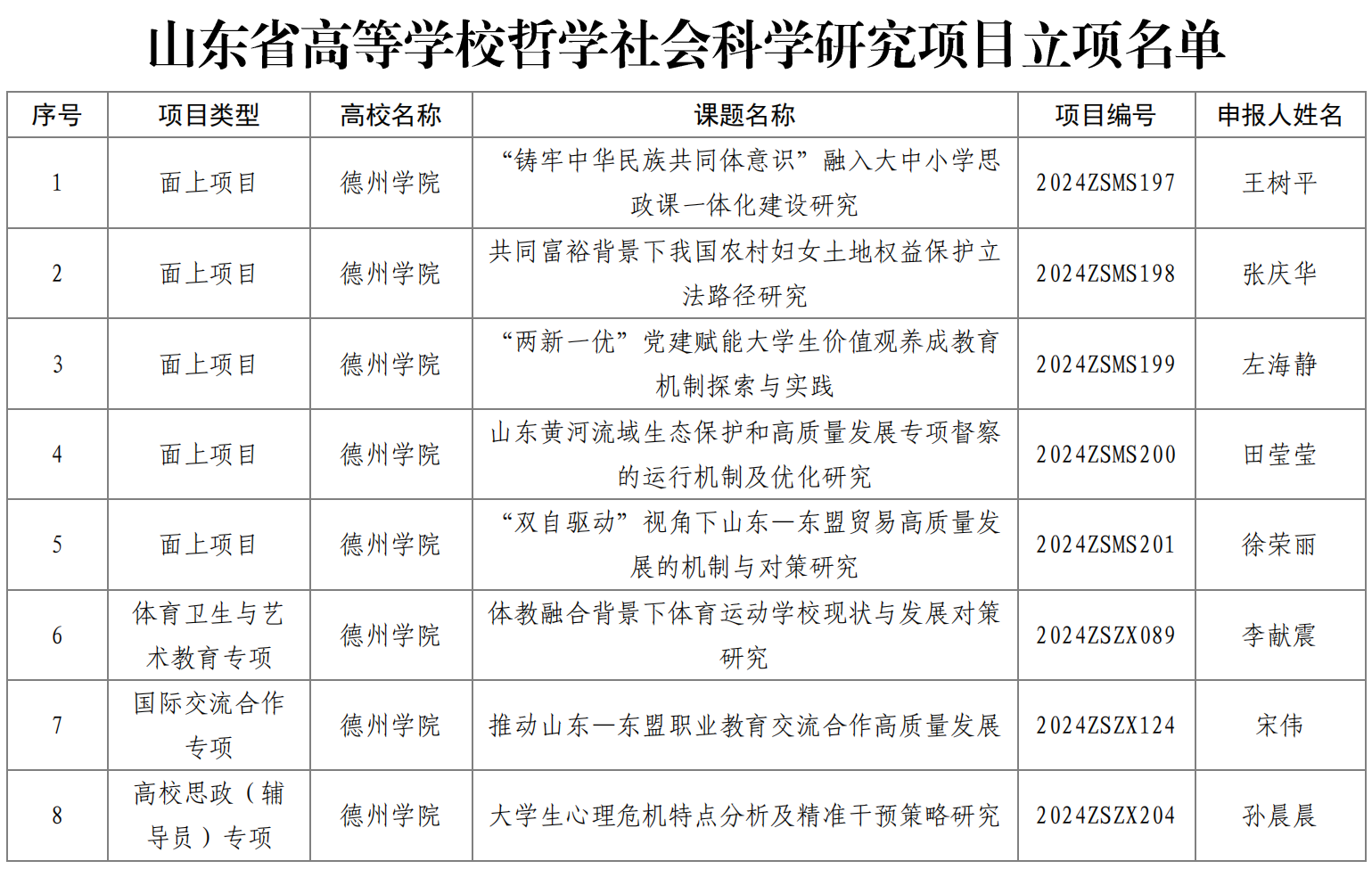 近日,山东省教育厅公布了山东省高等学校哲学社会科学研究项目立项名单,今年会8项项目予以立项,其中面上项目5项,体育卫生与艺术教育专项、国际交流合作专项、高校思政(辅导员)专项各1项。