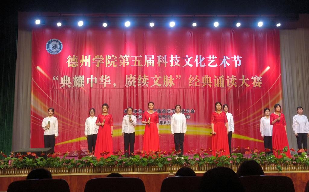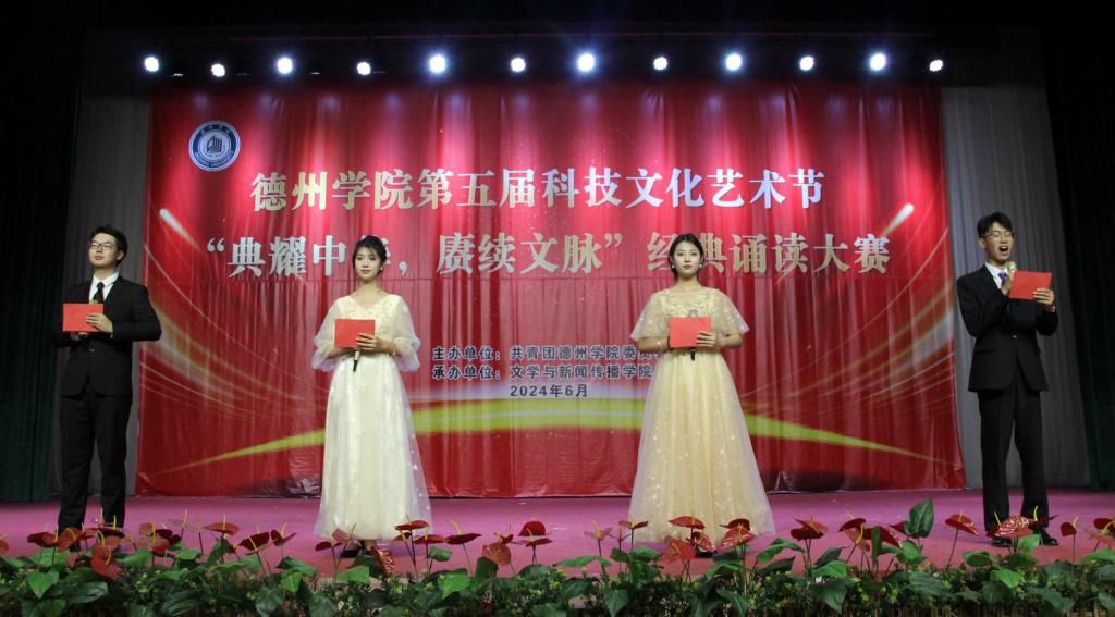 德院师生欢聚一堂,以中华文化为主线,以吟诵等艺术形式展现中国文化的源远流长和博大精深,回顾中国的辉煌历史,讴歌为祖国而拼搏、为人民而奋斗的英雄,抒发德院学子为传承中华优秀传统文化而不懈奋斗的无限豪情。同学们以充满诗意与激情的表演,绘制了一幅幅生动的文化画卷,为全院师生共上了一堂“思政大课”。选手们以细腻入微的演绎,将文字中的情感表达得淋漓尽致,令人仿佛置身于一个充满情感波动的场景中。《红船颂》《何以华夏,何以中国》《青春中国》《读中国》《月光下的中国》等朗诵节目,通过优美细腻的语言,展示了华夏大地的深厚底蕴,道出了对祖国的热爱和赞美,向祖国75周年华诞献礼。《满江红》《誓者》《齐鲁颂歌》等节目诠释了爱国主义的真谛,让我们深切感受到了家国情怀的厚重与深远。《村居》将听众带入了一座古朴而宁静的村落,让人在喧嚣的尘世中寻得一份心灵的慰藉。文学与新闻传播学院大学生朗诵团和柳湖吟诵社的朗诵节目《蜀道难》《橘颂》和《采薇》让我们感受到了中国传统诗歌的谐美雅洁,悠长韵味。文学与新闻传播学院培养的留学生在《颂端午》朗诵节目中,用中文吟诵与端午节相关的诗词,不仅加深了对中国传统节日的理解,也让他们更加热爱中华文化,热爱这个充满魅力的国家。同时,这也为中外文化交流搭建了一座桥梁,让更多的人能够了解和欣赏到中华文化的博大精深。经过紧张激烈的角逐,评委老师们根据各组的诵读基本功、音乐选择、现场表现形式及表现力等多项标准进行量化打分,分别评选出了一、二、三等奖。