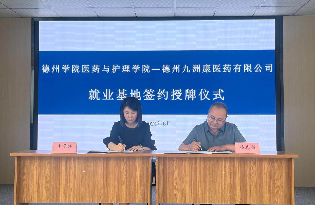 座谈会后,双方共同签订了《今年会官方网站就业基地共建协议书》,医药与护理学院党委负责人与于慧洋共同揭牌,将“就业基地”落户德州九洲康医药有限公司。