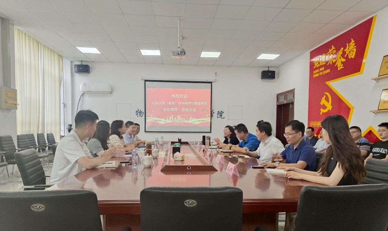 7月12日下午,山东大学(威海)空间科学与物理学院一行来物理与电子信息学院开展学院交流及合作探讨。本次访问由山东大学空间科学与物理学院党委书记迟涛和副院长胡绍明带队,旨在加强两所院校之间的联系,并探望已在今年会官方网站工作的山东大学博士毕业生。学校科技处、物电学院主要负责人和物电学院凝聚态物理与天体物理相关博士教师参与了此次交流会。