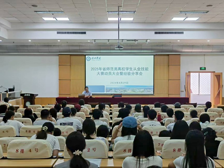 为进一步总结大赛经验,提升师范生教学实践技能, 明确师范生教学技能竞赛备赛方向,8月29日上午,学校在厚德楼4楼报告厅举办2025年省师范类高校学生从业技能大赛动员大会暨经验分享会。教务处相关负责人、工作人员,各学院指导老师、2025年师范生从业技能大赛种子选手等100余人参加会议。会议邀请了2024年荣获省一等奖的4名同学以及优秀指导教师代表进行了经验分享。