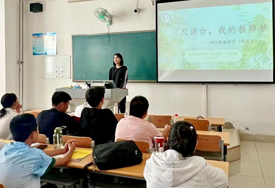 9月10日下午,物理与电子信息学院开展物理学师范生“我的教师梦”主题演讲活动。学生通过主题演讲展示物理学专业新生风采,增强了学生对教师职业的理解和认同,明确了未来人生规划。