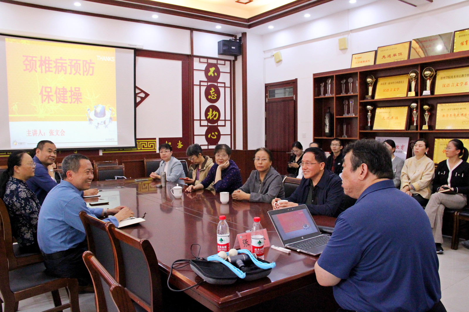 文学与历史文化学院开展“情暖文苑,爱满重阳”活动。学院特别邀请张文会主讲“颈椎病的治疗与预防”专题讲座。张文会深入浅出地讲解了颈椎病的类型和主要诱发原因,包括久坐、长时间使用电脑和低头玩手机等现代生活常见的不良习惯。针对如何预防颈椎病,专家提出了实用的建议,包括挤按颈项部肌肉、剥离胸锁乳突肌、叩打对侧斜方肌和点按枕骨隆突等方法。此外,张文会还现场指导老师们练习耸肩动作等系列颈椎保健动作,这种简单的运动能够有效锻炼肩胛提肌,对预防颈椎病大有裨益。