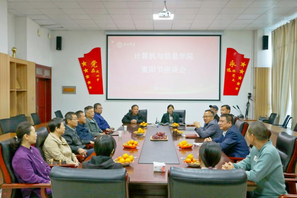 计算机与信息学院举办“金秋助老 暖度重阳”为主题的重阳节座谈会。学院班子成员与退休教师热情交谈,询问老教师们的身体状况和生活情况并介绍了学院近期的发展概况,感谢老教师对学院事业发展作出的贡献,并希望退休教师们保重身体,多回学院看看,多为学院的发展提出宝贵意见建议。退休教师对学院的关怀表示衷心感谢,对学院事业发展取得的成绩感到由衷高兴,表示将一如既往关心支持学院各项事业的发展。