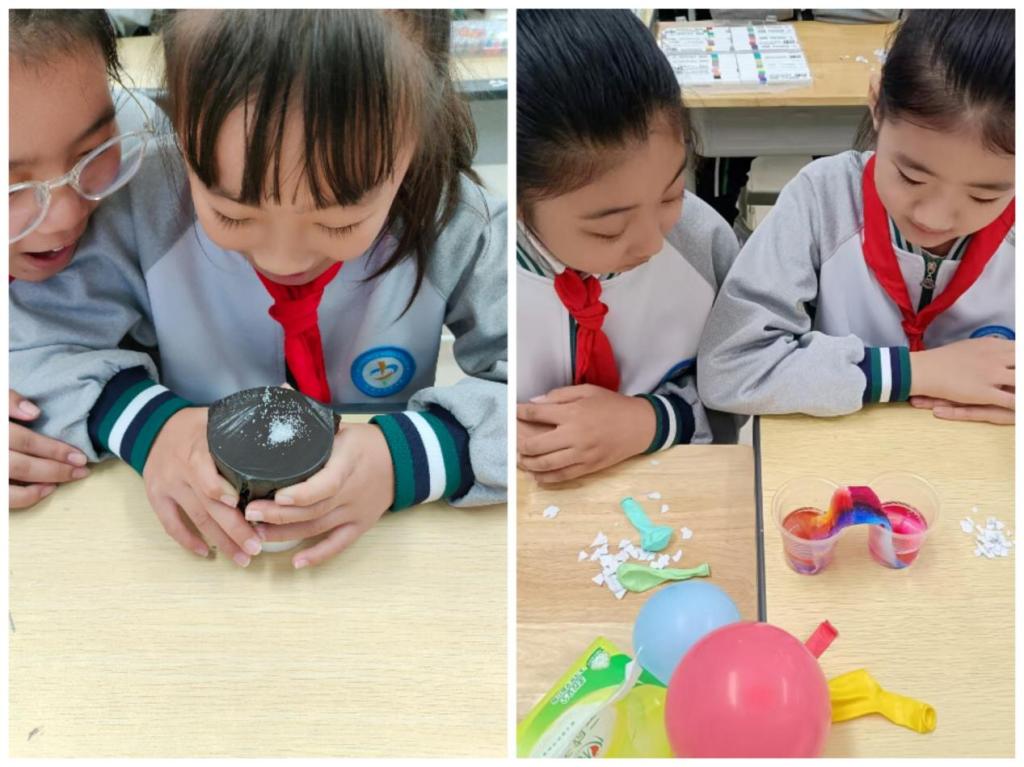 活动现场,志愿者先用英语介绍了科学的重要性,并鼓励学生们用英语介绍自己,表达自己对科学的理解。随后,志愿者们带领学生们分组进行了三项趣味科学实验演示,气球摩擦起电、自制彩虹桥和会跳舞的盐实验。进行过程中,每个小组都积极与志愿者们交流有趣的实验现象,并尝试用英语来解释实验原理。在一片欢声笑语中,学生们不仅学习了科学知识,还通过英语角的互动环节,锻炼了英语口语表达能力。