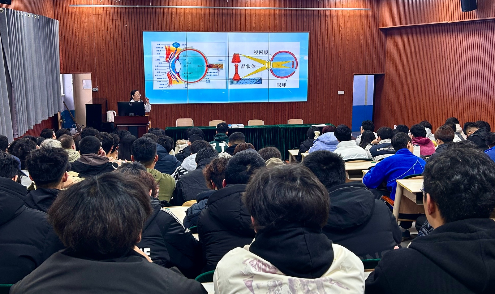 讲座中,眼科专家孙荣霞基于丰富的临床经验和专业知识,向学生们介绍了近视的成因及其预防措施,强调了养成良好用眼习惯的重要性。同时,心理健康专家田安庆则围绕心理健康的定义、重要性以及如何有效应对日常生活中的压力等问题,分享了一系列实用的调节情绪和心理调适的方法。两位专家的讲解深入浅出,内容既专业又贴近学生实际需求,受到了在场同学的热烈欢迎和积极响应。