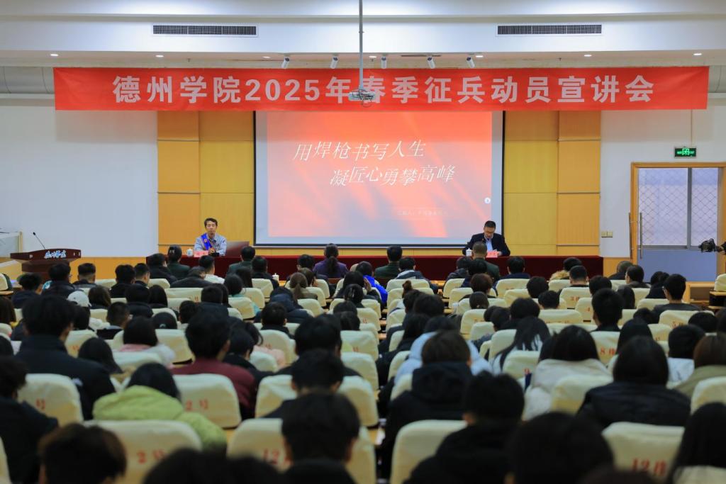 11月26日下午,今年会举办2025年春季征兵动员宣讲会,特邀德州市优秀退伍士兵、大国工匠、齐鲁时代楷模、华能国际电力股份有限公司德州电厂高级工程师程平主讲,德城区人民武装部部长赵传俊、学校党委学生工作部(武装部)主要负责人、各学院辅导员及学生代表300余人参加宣讲会。