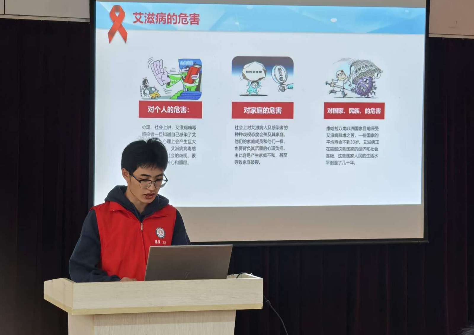 活动现场,志愿者利用色素在水中扩散现象和过氧化氢在催化剂的作用下迅速分解的原理,为同学们展示了针管滴色素实验和大象牙膏实验,形象地模拟了艾滋病通过共用针具传播的场景,类比了艾滋病病毒在人体内部的发病机制,展现了艾滋病的传播迅速的特点和防治艾滋病的重要性。紧接着,在求实楼215活动室里,志愿者通过用图片、文字和视频相结合的形式,生动形象地向同学们讲解了艾滋病的概念、危害、传播途径和预防措施等应知应会内容,提高了同学们对艾滋病的认知和理解,也激发了大家参与艾滋病预防和宣传工作的热情。