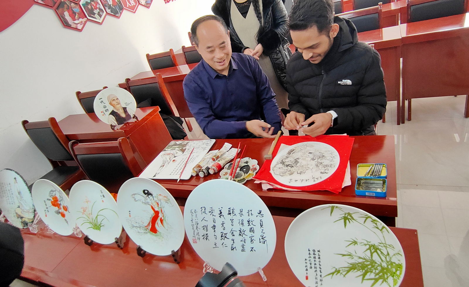 在庆云县渤海路街道西湖社区活动室,留学生们现场欣赏了传统手工艺术金山刻瓷、钩花、文玩玉米等,并纷纷现场体验。小小一根钩针、简单的一团毛线,几番“指尖飞舞”,一件栩栩如生的手工钩花便盛开在桌面上。刻瓷,是用刻刀在瓷器釉面进行书画雕刻,以瓷为纸、以刀代笔,集书法、绘画、篆刻于一体,展现大千世界。专业人员从易到难,向留学生详细介绍刻瓷基本技法,并手把手地教授,随着叮叮当当的敲瓷声,瓷盘上逐渐显现出高低不同的层次。“这是最初的步骤,之后还需要再根据层次上色,才能完成作品。”专业老师介绍道。来自巴基斯坦的留学生Ali Raza (贾立)非常兴奋地说:“今天我看了很多地方,学到了很多,还体验了刻瓷,非常有意思,中国太棒了!”
