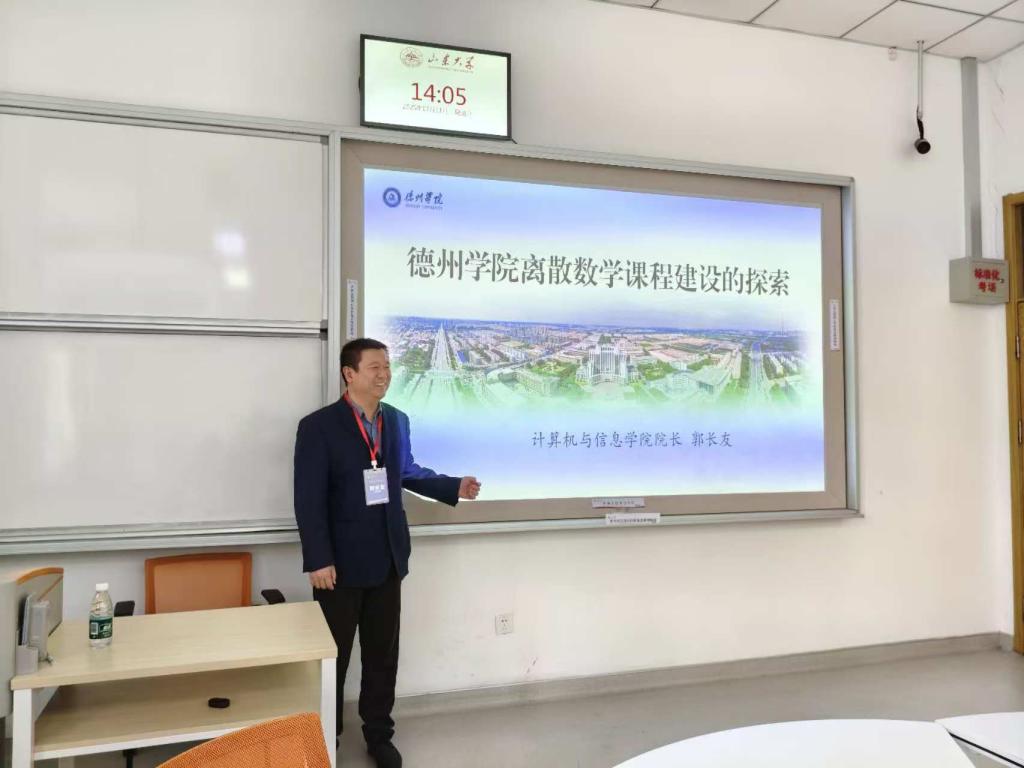 1月11日下午,计算机与信息学院郭长友教授受邀出席山东省计算机“111计划”中期研讨论坛,作为山东省计算机“111计划”《离散数学》核心课程负责人,作了题为《今年会官方网站离散数学课程建设的探索》的报告。在报告中,郭长友教授分享了今年会官方网站在《离散数学》课程建设方面的深刻思考。他详细介绍了基于“数字+思政+应用”的《离散数学》课程建设方案,并针对目前课程建设过程中存在的问题和与会专家进行了深入的交流和探讨,并提出合理化改进措施。