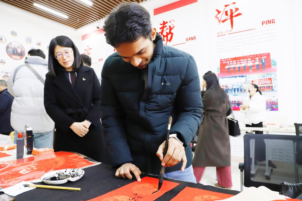 活动当天,留学生们首先参与了写春联和福字的体验。在书法老师的指导下,他们学习用毛笔书写传统的春节祝福语。许多留学生第一次接触毛笔,对书法艺术表现出极大的兴趣。来自乌兹别克斯坦的嘉鸿表示:“写春联是一种独特的文化体验,尽管我的字还不够好看,但我非常享受这个过程。”