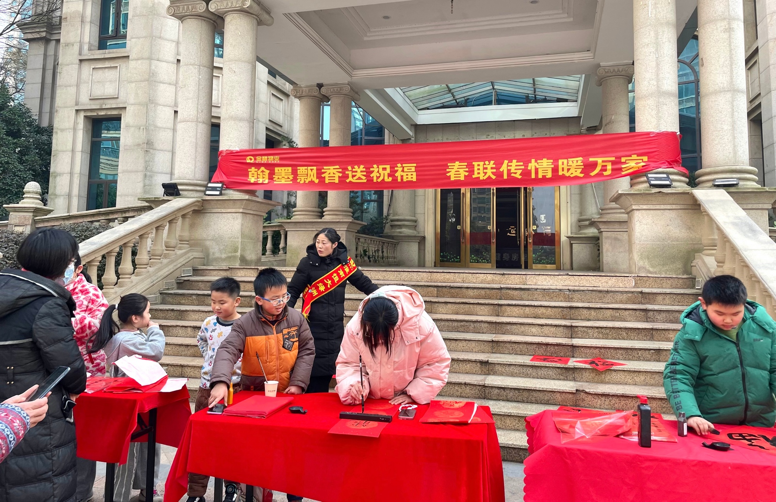 有的同学志愿走进社区,与社区居民进行一对一结对,专注指导居民书写春联。他们耐心地帮助居民纠正书写姿势,细致讲解笔法运用,分享春联的书写技巧。在志愿者的指导下,居民们满怀对新年的美好期许,挥毫泼墨,将祝福融入一副副春联之中。活动现场墨香四溢,欢声笑语不断,处处洋溢着喜庆的节日气息。