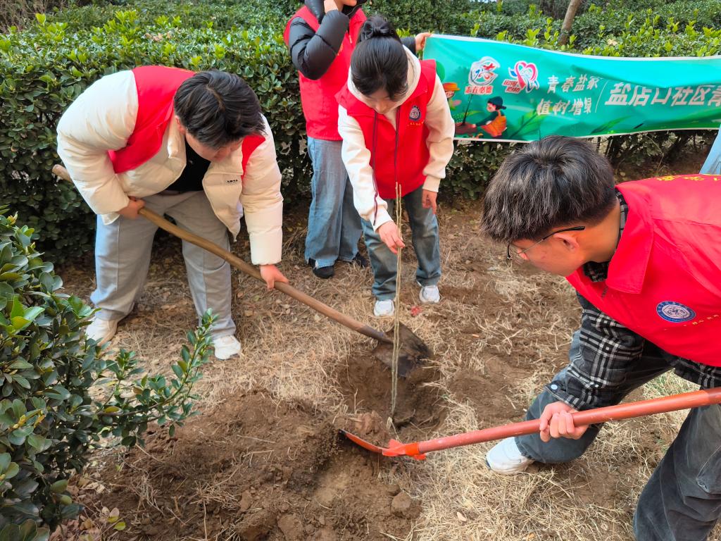 为引导大学生积极参与社区建设,以实际行动传播绿色环保理念,营造更加宜居的社区环境。3月9日,药学院闪“药”青春志愿服务队前往盐店口社区,开展了“‘植’此青绿,开环保‘药’方”植树节活动。志愿者们热情高涨,干劲十足,分工明确。在社区专业人士的带领和指导下,志愿者们拿起铁锹,与社区青年一起挥锹铲土、挖坑培土、扶植树苗、拎桶浇水,合力种下一棵棵树苗,筑起社区生态文明成长林,为美丽社区增绿添彩。大家在许愿卡上写下祝福,并将其挂上树梢,寄托对春天新生的希望。此次新春植树活动,不仅为社区增添了绿色,也让志愿者们在劳动中感受到了生态之美和绿色环保的重要性,传承了雷锋的团结协作精神以及奉献精神。药学院将以此为契机,深化生态文明教育和劳动实践,培养学生的社会责任感,弘扬植绿、护绿、爱绿的社会文化新风,倡导健康、文明、绿色、环保理念,带领师生共建文明美丽社会。