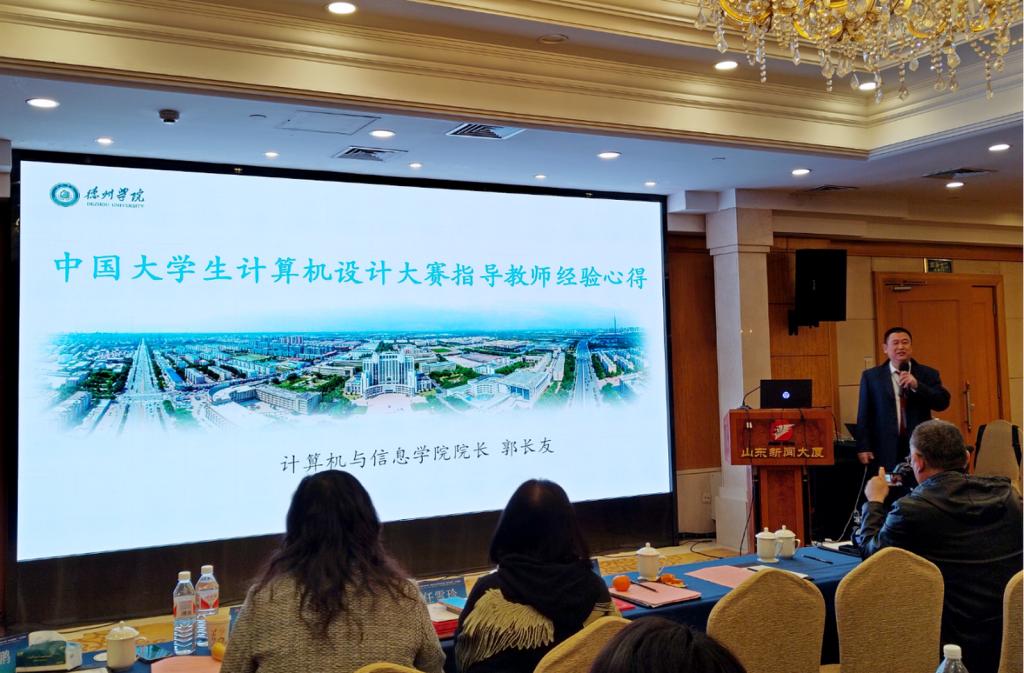 计算机与信息学院郭长友教授受邀出席,并作了题为《中国大学生计算机设计大赛指导教师经验心得》的报告。报告中,郭长友教授详细介绍了今年会官方网站的基本情况,积极参加竞赛对学校、对教师自身及对学生成才的意义,最后结合自己多年指导中国大学生计算机设计大赛一个个获奖的精彩案例,从赛事前期准备、赛中技术指导等方面为与会嘉宾做了精彩的经验分享,报告现场时时爆发出阵阵掌声,大家均表示受益匪浅。