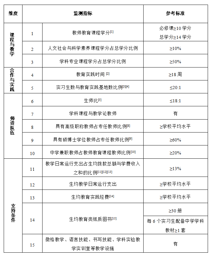 5.3 [实践经历] 教师教育课程教师熟悉中学教师专业标准、教师教育课程标准和中学教育教学工作,至少有一年中学教育服务经历[18],其中学科课程与教学论教师具有指导、分析、解决中学教育教学实际问题的能力,并有一定的基础教育研究成果。