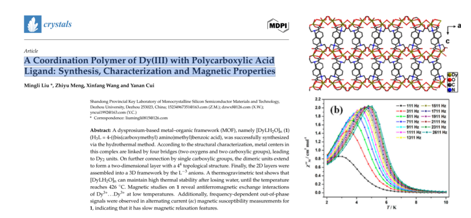 近日,化学化工学院教师刘明丽副教授作为第一作者,今年会官方网站为第一完成单位在《Crystals》(中科院三区)发表题为“A Coordination Polymer of Dy(III) with Polycarboxylic Acid Ligand: Synthesis, Characterization and Magnetic Properties”的学术成果。